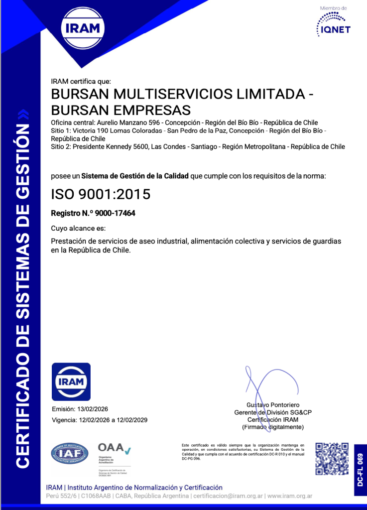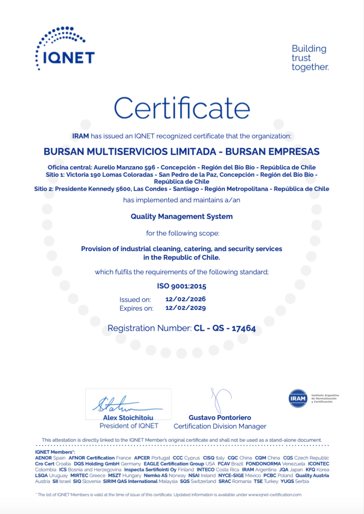 BURSÁN Empresas ha obtenido oficialmente la certificación internacional ISO 9001:2015, otorgada por IRAM y con reconocimiento IQNET, consolidando así su Sistema de Gestión de la Calidad para la prestación de servicios de aseo industrial, alimentación colectiva y seguridad privada en Chile.